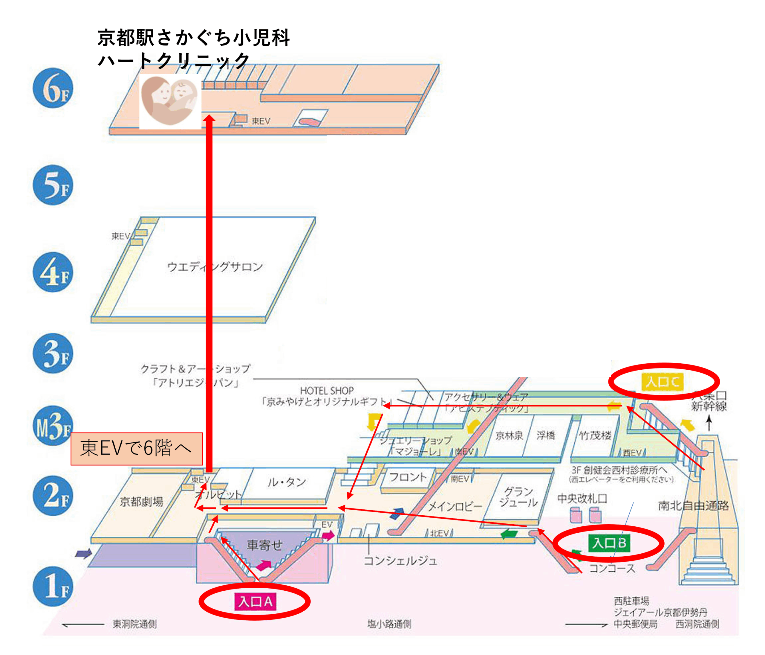 中央改札をでて右手に進んでいただき、京都劇場側からホテル内に入り、2階ロビーから東エレベーターで6階へお越しください。